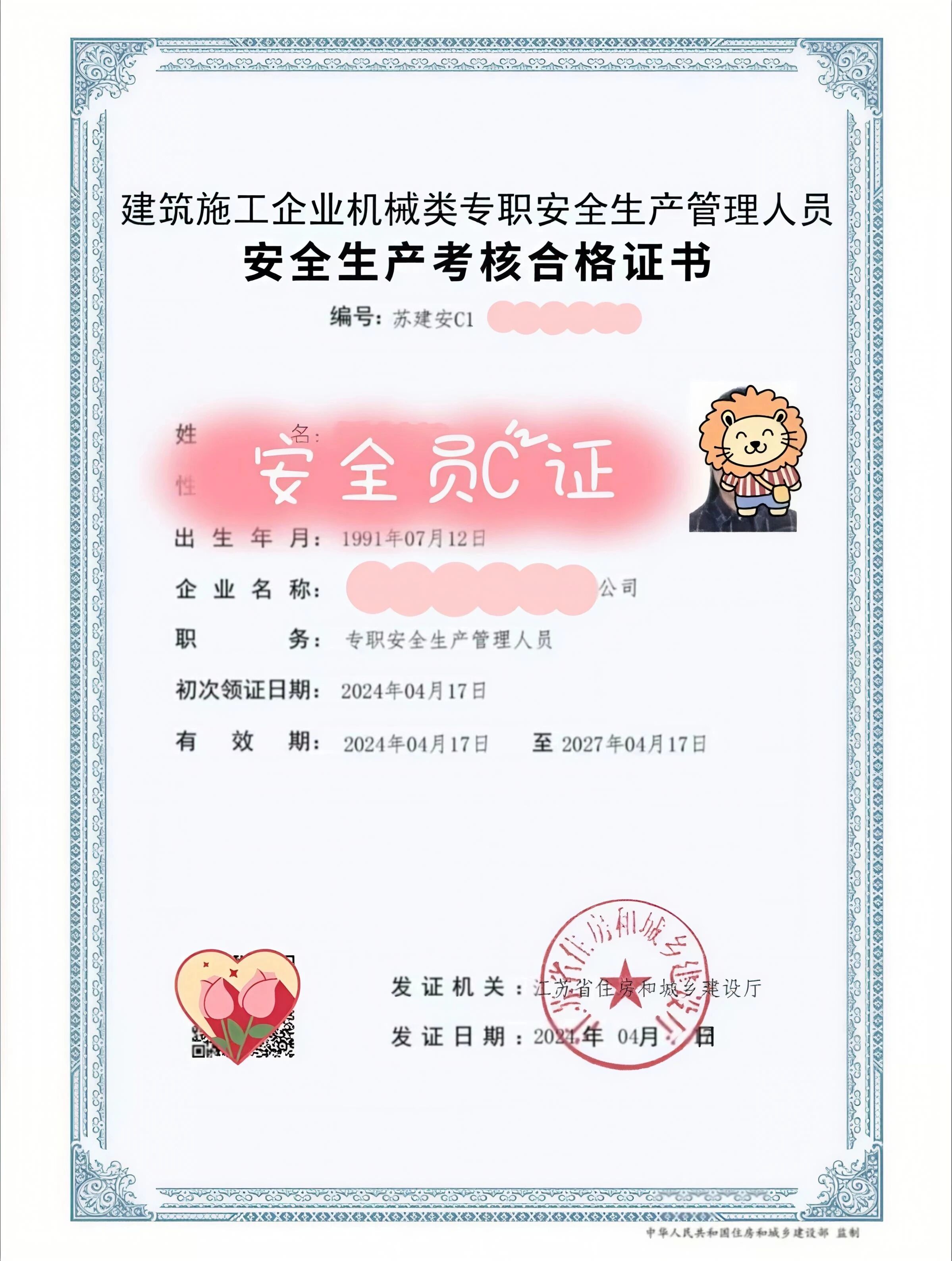 C1证(机械类专职安全生产管理人员)是建筑施工现场特种设备安全管理的法定资质,持证人员可从事起重机械、土石方机械、桩工机械等设备的安全生产管理工作。该证书是办理安全生产许可证的必备要件,也是企业专职安全管理人员持证上岗的硬性要求。